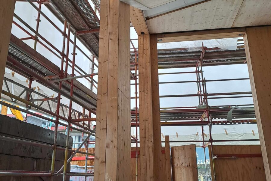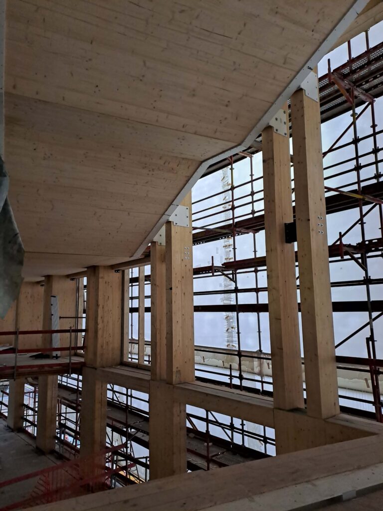 La nouvelle structure est principalement en bois lamellé croisé pour les dalles et bois lamellé collé pour les poutres et les colonnes.
